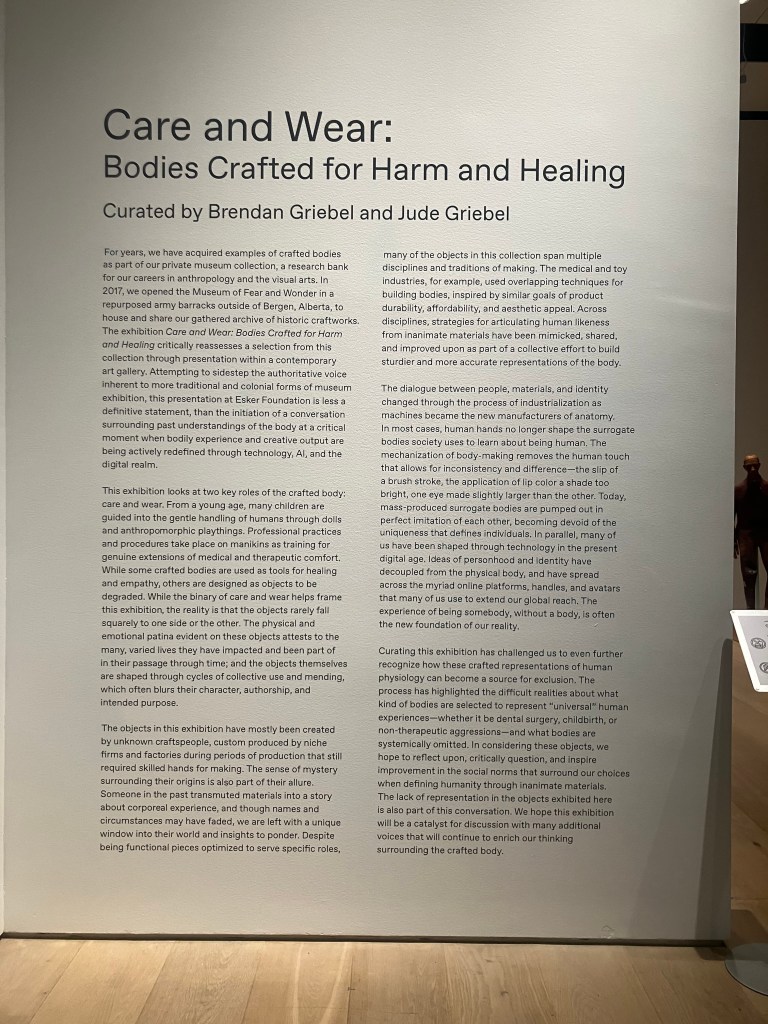 In fall 2023, the Esker Foundation, a non-profit art space in Calgary, Alberta, exhibited dozens of dolls, mannequins, and other representations of human beings from the holdings of the Museum of Fear and Wonder, under the exhibition title Care and Wear: Bodies Crafted for Harm and Healing. The curator statements outline that the figures are made for the most part before the introduction of mass production methods and bear on their bodies the marks of their creation and history.