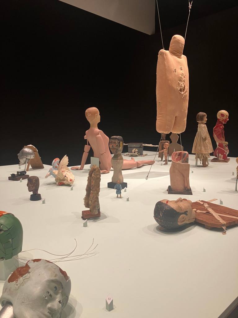 But at least four of us, counting the collectors, experience it. Of my Bedford doll, Jude Griebel says in the audio segment, “You’re seeing this Bedford doll opened up, its body opens, but there’s this happy, pleased expression on its face.” Her teeth are somewhat askew in the mouth, so she gives the impression of having been punched in the face and smiling open-lipped through the blood. “It has these very sensitive details; it has a leather body that’s made to be held and moved. So it is quite vivacious in contrast to a lot of other mannequins before and after, which makes it a very unique object.” Sensitive – perhaps, capable of sensing; vivacious – perhaps, capable of living. He also says of Auzoux échorché models: “They don’t look like dead bodies. They look like something that’s alive and content in its dissected state.” And if these ones are alive and content, others, surely, are alive and in despair.